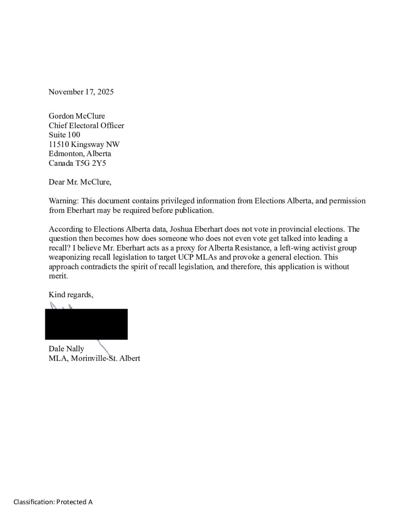 I respectfully request the recall of Dale Nally, Alberta’s Minister of Service Alberta and Red Tape Reduction and MLA for Morinville – St.Albert. His record demonstrates a clear failure to represent his constituents.